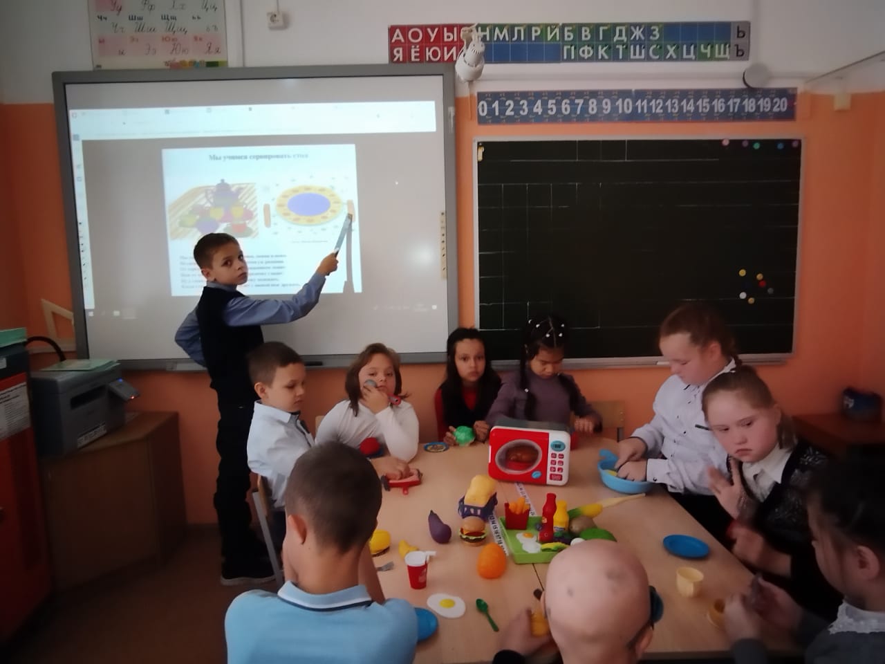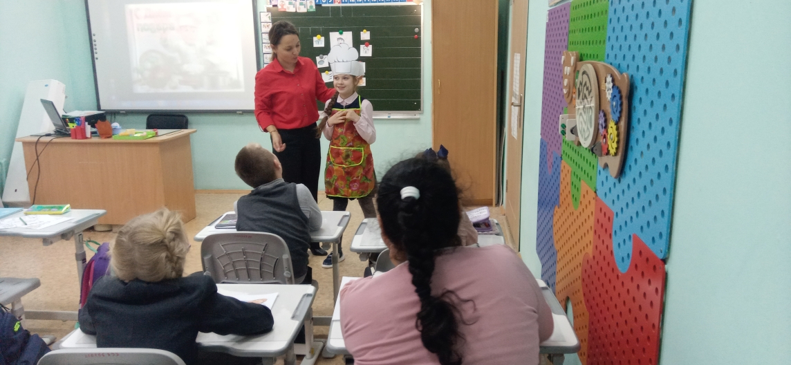 В начальных классах проводились классные часы, где дети познакомились: с профессией повара, его трудовыми процессами, с предметами – помощниками. Закрепили знания о столовой посуде. Играли в сюжетно-ролевые игры (например, «Повар»).Традиционно на классных часах, не забыли обсудить тему «Здоровое питание». Учащиеся приготовили для поваров поделки.